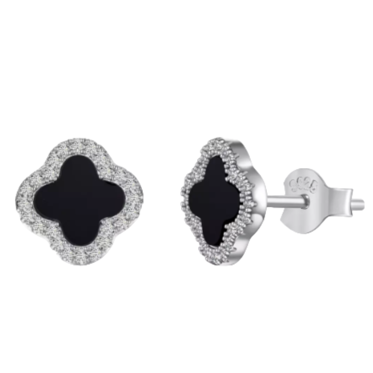 Brinco Trevo Pedra Ônix Preta Cravejada Zircônia Prata 925 Legítima