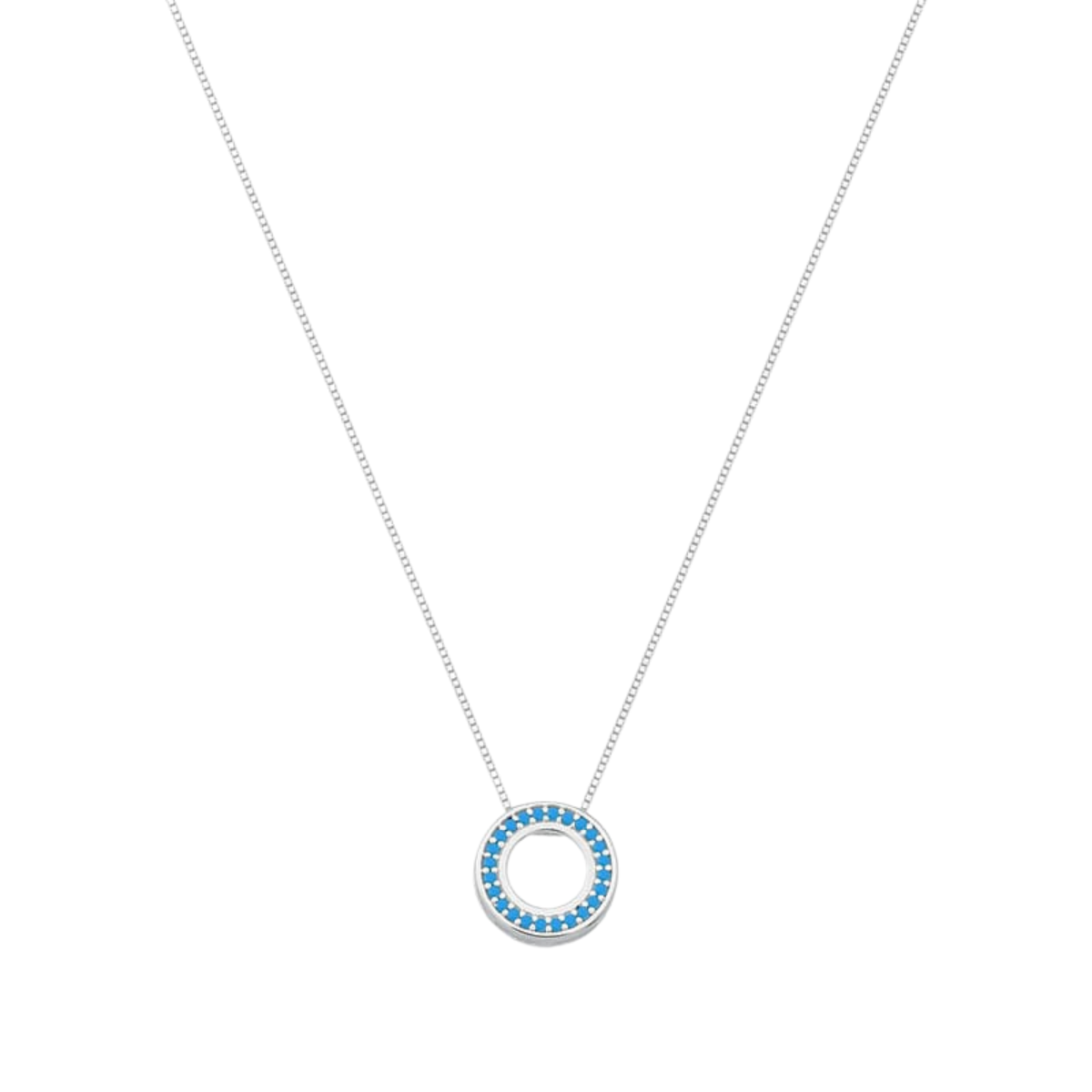 Corrente de prata veneziana de 45 cm, com pingente redondo vazado borda zircônia turquesa.