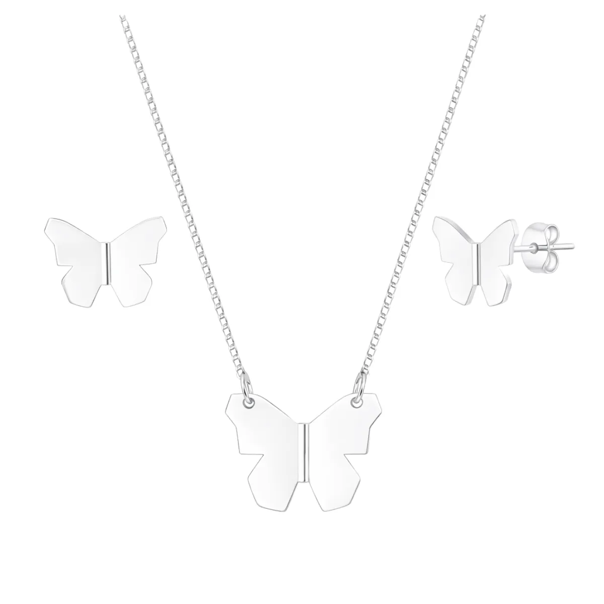 O Conjunto Borboleta Origami é composto por colar e brinco com design inspirado nas dobraduras do origami, formando uma delicada borboleta — símbolo de transformação, leveza e renovação. Confeccionado em Prata 925 legítima, é perfeito para quem busca um acessório sofisticado, minimalista e cheio de significado.