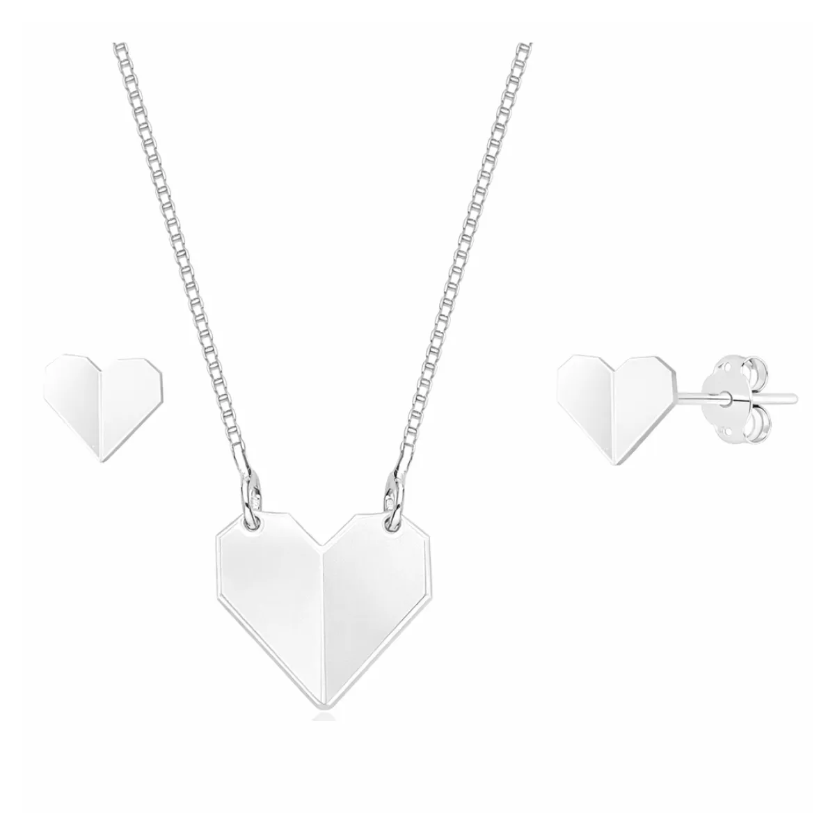 O Conjunto Coração Origami é confeccionado em Prata 925 legítima e traz um design exclusivo inspirado na arte do origami. Composto por corrente veneziana V12 de 40 cm, um pingente em formato de coração origami e um par de brincos delicados, é a joia perfeita para expressar amor de forma criativa e sofisticada.