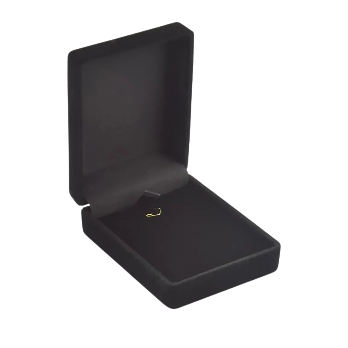 O estojo em veludo preto é ideal para acomodar brincos e correntes com elegância e segurança. Seu acabamento macio protege as peças contra riscos e proporciona uma apresentação refinada, sendo perfeito para presentes ou para manter suas joias bem cuidadas.