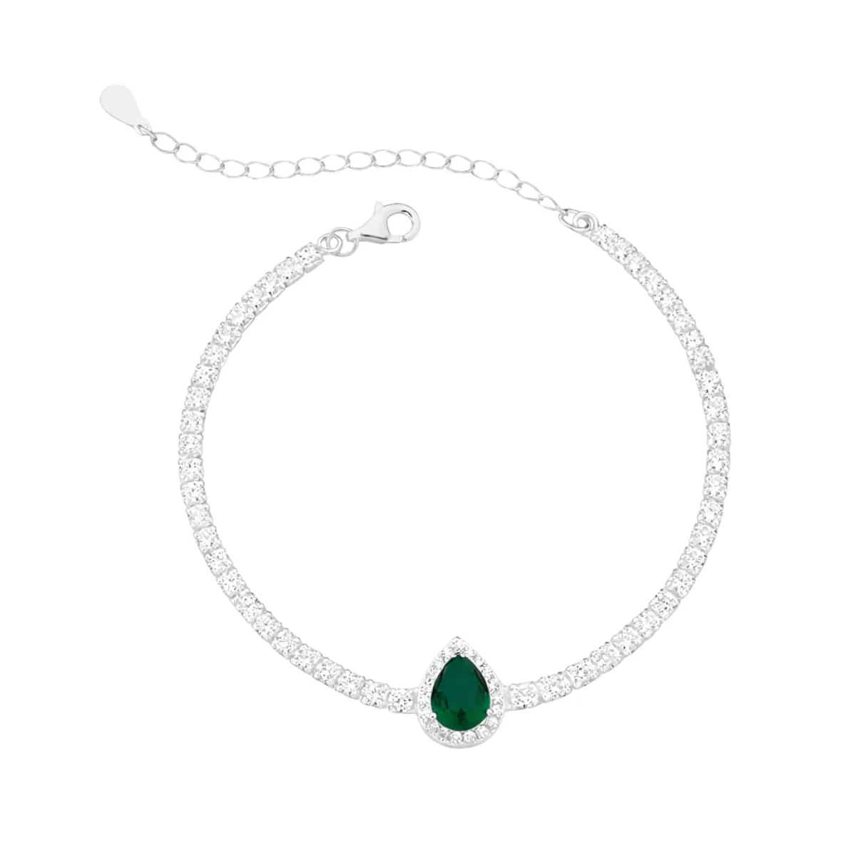 A Pulseira Riviera Gota Verde é uma joia deslumbrante, confeccionada em Prata 925 legítima com acabamento prata branca e pingente em formato de gota com zircônia verde.